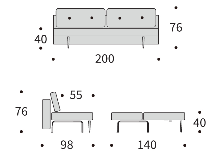 Zahvaljujoč dovršenemu mehanizmu lahko sedežna garnitura Recast v nekaj sekundah raztegnete v prostorno ležišče velikosti 140x200 cm. Naslonske blazine se preprosto odstrani, sedež potegne naprej, naslonjalo pa se položi, kar tvori popolnoma ravno in udobno posteljo. Izbirate lahko med modelom z rokonasloni ali brez, ter si dodatno udobje zagotovite z ujemajočim taburejem, ki služi kot podaljšek ali ločen sediščni element.