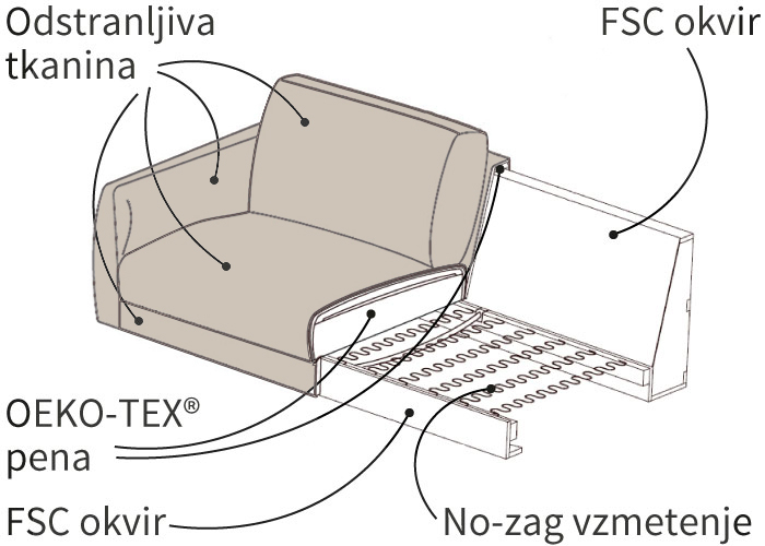 - OEKO-TEX® certificirana visokoelastična pena poskrbi za čvrsto, a udobno sedišče.